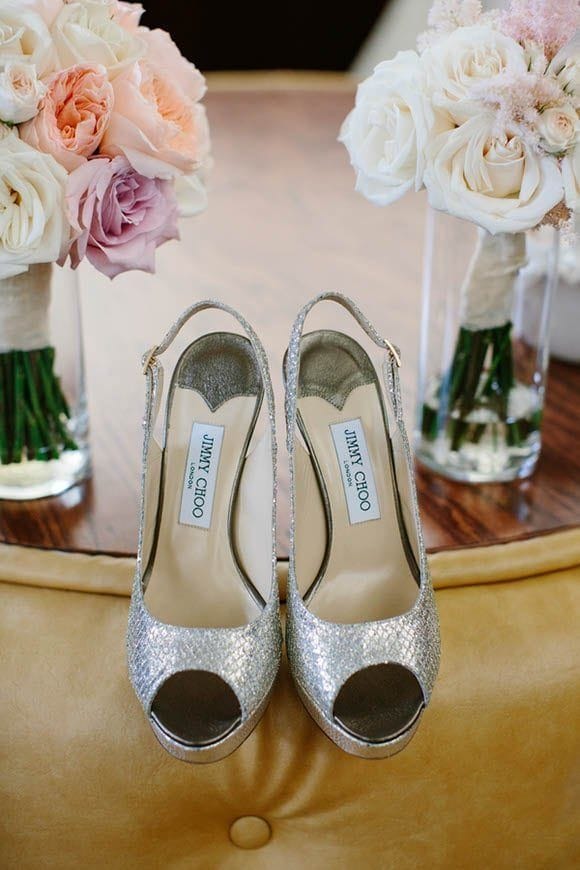 The overall theme was pink champagne, with the Bridesmaids in pale pink dresses, pink polish on Kelsey’s nails, and a simple ivory and peachy-pink rose bouquet with lilac accents. To add a touch of sparkle, Kelsey also wore a pair of exquisite Jimmy Choo silver sling-back pumps with open toes – with a pink pedicure, of course.