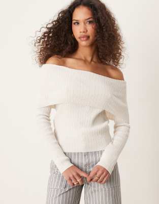 ASOS DESIGN linen blend knitted bardot top in cream-White