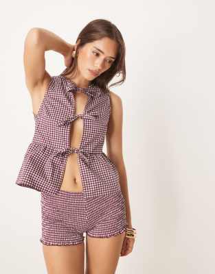 Pieces tie front balloon sleeve top with contast rikrak trim in white