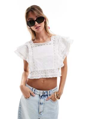 Miss Selfridge lace puff sleeve tie front top-Brown