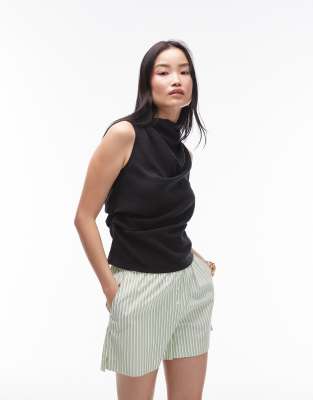 River Island Asymmetric neck ruched mesh top in brown – dark