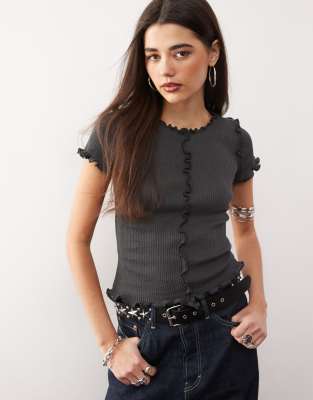 Monki structured knitted t-shirt with ruffle hem in dark grey