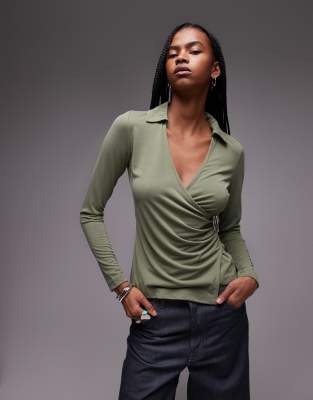 Tops by Topshop Spread collar Plunge neck Long sleeves Wrap front Ruched details Regular fit