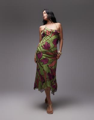 Topshop godet hem occasion midi dress in pink and green floral print-Multi