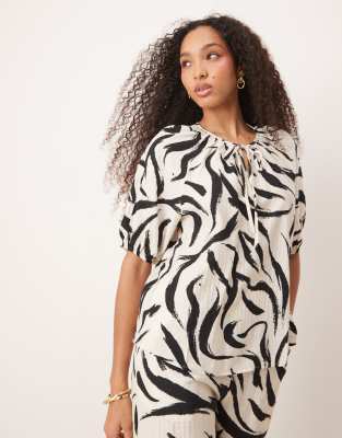 Vila short sleeve tie neck top co-ord in monochrome print-Multi